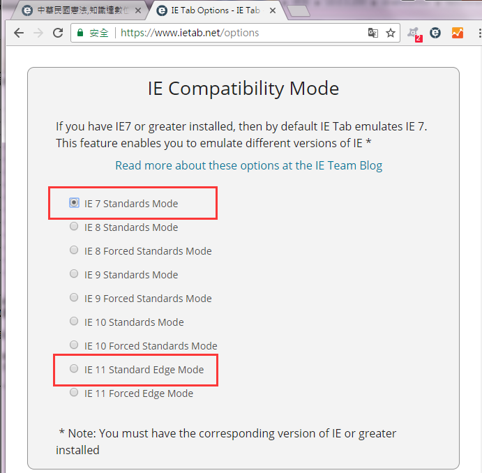 Step 2 開啟IE Tab設定頁面後,往下拉到「IE Compatibility Mode」區塊,建議選擇【IE 7 Standards Mode】或【IE 11 Standard Edge Mode】,才可正常開啟播放頁面。