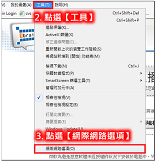 2 點選工具列的【工具】 → 3 【網際網路選項】。